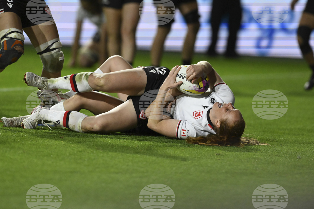 New Zealand's Kaipo Olsen-Baker, right, and Canada's Courtney O'Donnell, bottom, challenge for the ball during the Women's Rugby World Cup 2025 semifinal match between New Zealand and Canada in Bristol, England, Friday, Sept. 19, 2025.(AP Photo/Anthony Upton)