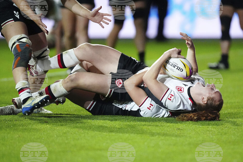 Canada's Alex Tessier scores a try during the Women's Rugby World Cup 2025 semifinal match between New Zealand and Canada in Bristol, England, Friday, Sept. 19, 2025.(AP Photo/Anthony Upton)