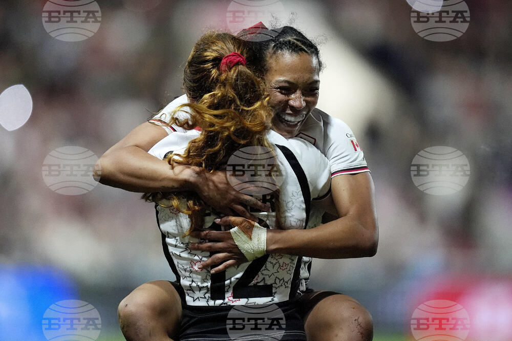 Canada's Justine Pelletier, left, and Gillian Boag celebrate after winning the Women's Rugby World Cup 2025 semifinal match between Canada and New Zealand at Ashton Gate, Bristol, England, Friday Sept. 19, 2025. (Andrew Matthews/PA via AP)