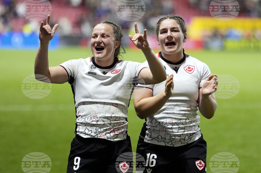 Canada's team members celebrate as they won the Women's Rugby World Cup 2025 semifinal match between New Zealand and Canada in Bristol, England, Friday, Sept. 19, 2025.(AP Photo/Anthony Upton)