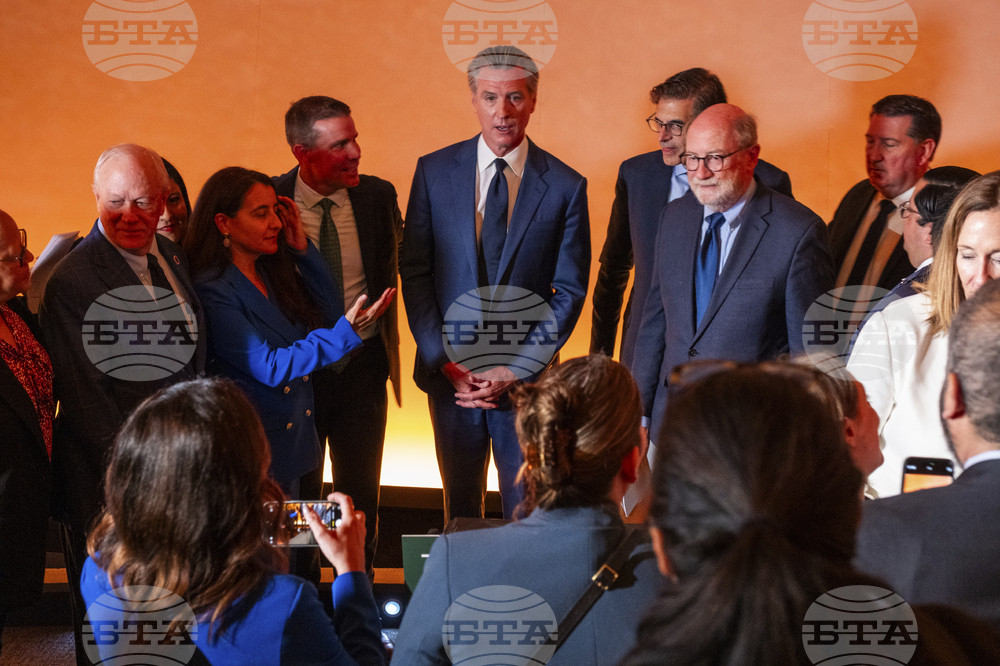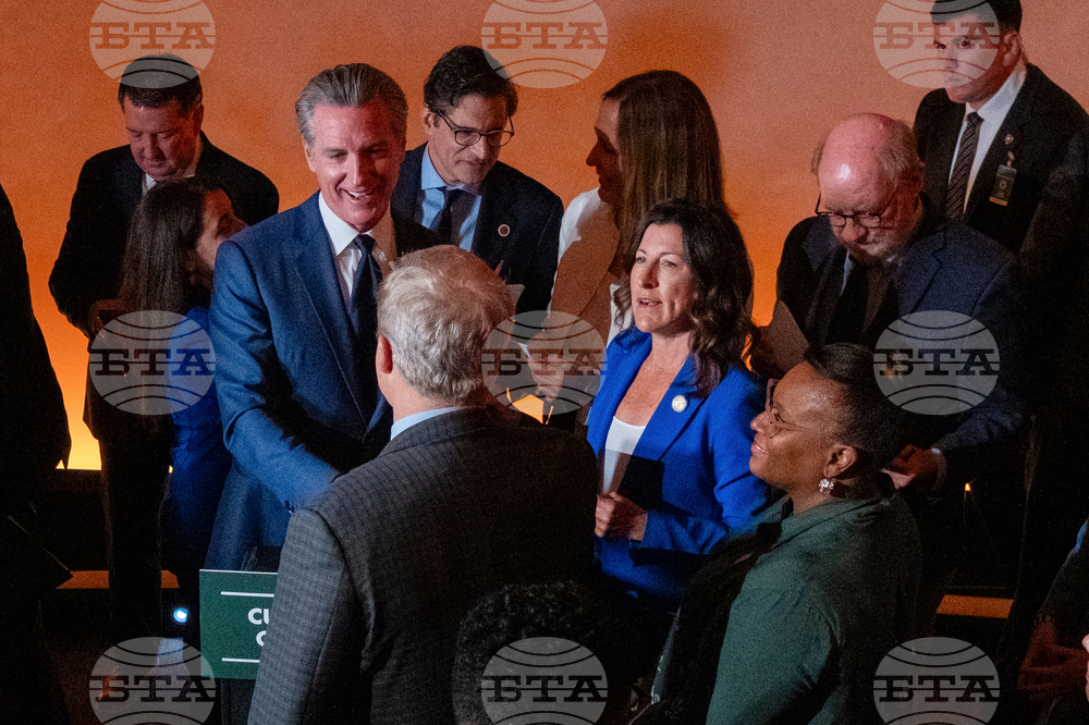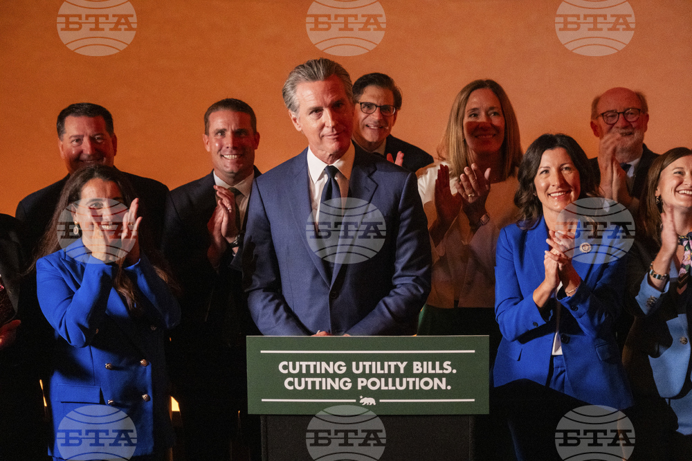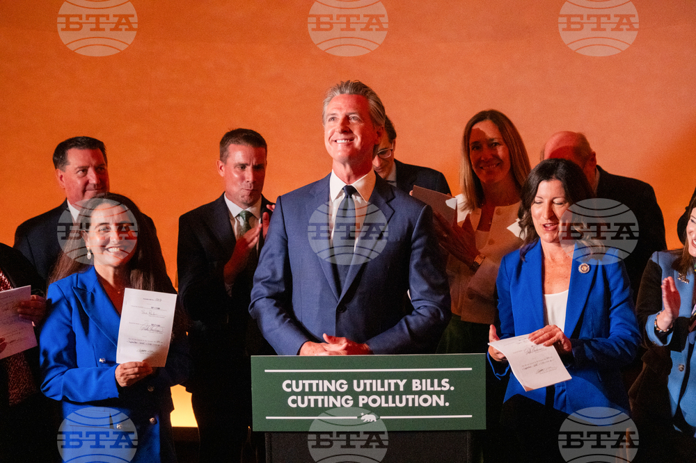 California Gov. Gavin Newsom hosts a press conference and signs a slew of climate initiative bills at the Academy of Sciences, Friday, Sept. 19, 2025, in San Francisco. (AP Photo/Camille Cohen)
