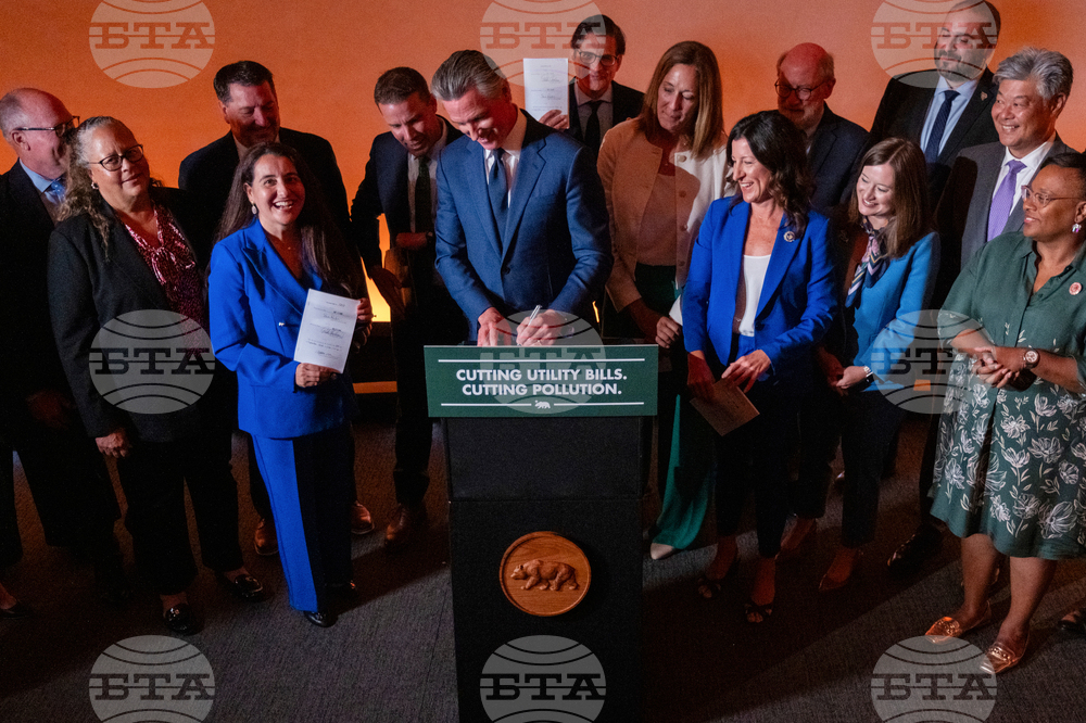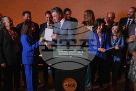California Gov. Gavin Newsom signs a slew of climate initiative bills at the Academy of Sciences, Friday, Sept. 19, 2025 in San Francisco. (AP Photo/Camille Cohen)