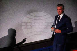 California Gov. Gavin Newsom casts a shadow as he hosts a press conference and signs a slew of climate initiative bills at the Academy of Sciences, Friday, Sept. 19, 2025, in San Francisco. (AP Photo/Camille Cohen)
