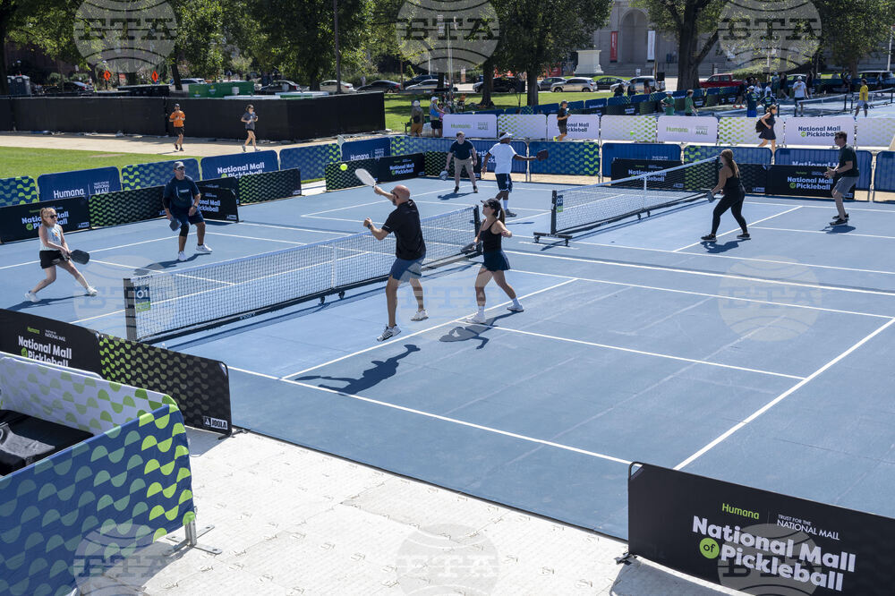 IMAGE DISTRIBUTED FOR TRUST FOR THE NATIONAL MALL - Pickleball players competing on the courts at the third National Mall of Pickleball, Friday, Sept. 19, 2025, in Washington. (Kevin Wolf/AP Content Services for Trust for the National Mall)