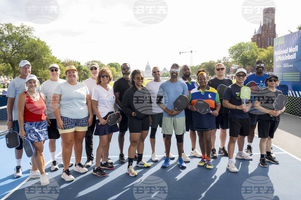 IMAGE DISTRIBUTED FOR TRUST FOR THE NATIONAL MALL - Participants of the Ultimate Duo Tournament gather to celebrate the positive impacts of pickleball and the spirit of community during the National Mall of Pickleball, Saturday, Sept. 20, 2025, in Washington. (Kevin Wolf/AP Content Services for Trust for the National Mall)