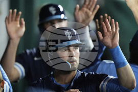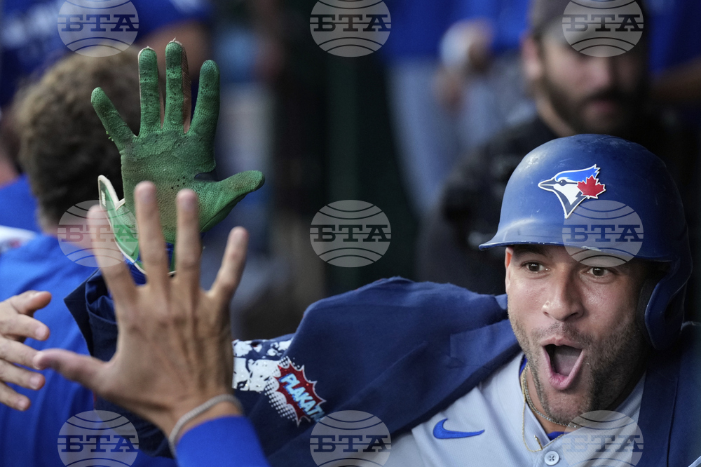 Toronto Blue Jays' George Springer celebrates in the dugout after hitting a solo home run during the first inning of a baseball game against the Kansas City Royals, Friday, Sept. 19, 2025, in Kansas City, Mo. (AP Photo/Charlie Riedel)