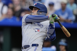 Toronto Blue Jays' George Springer hits a double against the Kansas City Royals during the third inning of a baseball game Saturday Sept. 20, 2025, in Kansas City, Mo. (AP Photo/Ed Zurga)