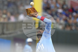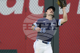 Kansas City Royals' Adam Frazier catches a fly ball for the out on Toronto Blue Jays' Nathan Lukes during the first inning of a baseball game Friday, Sept. 19, 2025, in Kansas City, Mo. (AP Photo/Charlie Riedel)