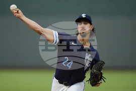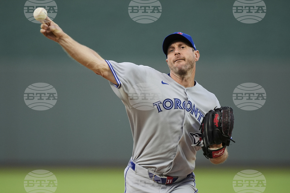 Toronto Blue Jays starting pitcher Max Scherzer throws during the first inning of a baseball game against the Kansas City Royals, Friday, Sept. 19, 2025, in Kansas City, Mo. (AP Photo/Charlie Riedel)