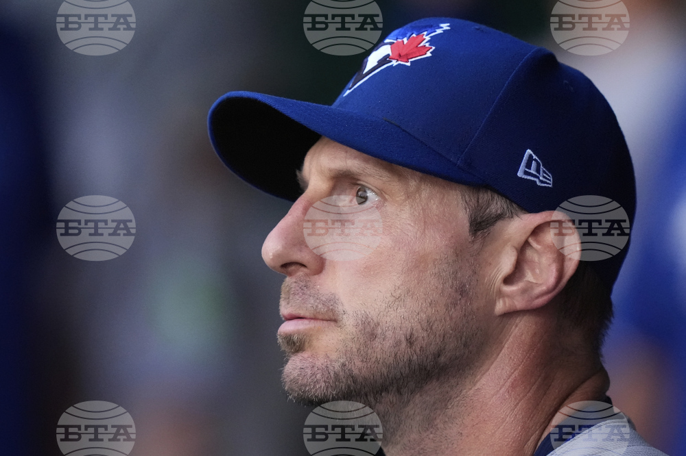 Toronto Blue Jays starting pitcher Max Scherzer watches from the dugout after coming out of the game during the first inning of a baseball game against the Kansas City Royals, Friday, Sept. 19, 2025, in Kansas City, Mo. (AP Photo/Charlie Riedel)