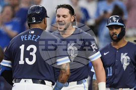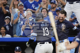 Kansas City Royals' Salvador Perez (13) celebrates with Maikel Garcia (11) after hitting a three-run home run during the first inning of a baseball game against the Toronto Blue Jays, Friday, Sept. 19, 2025, in Kansas City, Mo. (AP Photo/Charlie Riedel)