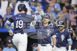 Kansas City Royals' Michael Massey (19) celebrates with Adam Frazier (26) after hitting a two-run home run during the first inning of a baseball game against the Toronto Blue Jays, Friday, Sept. 19, 2025, in Kansas City, Mo. (AP Photo/Charlie Riedel)