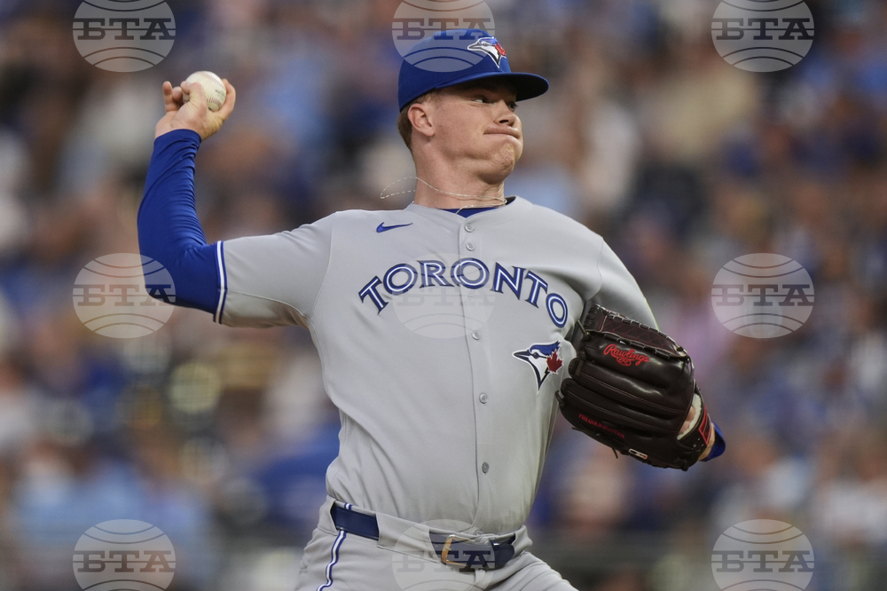 Toronto Blue Jays relief pitcher Braydon Fisher throws during the first inning of a baseball game against the Toronto Blue Jays, Friday, Sept. 19, 2025, in Kansas City, Mo. (AP Photo/Charlie Riedel)