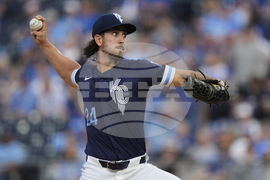 Toronto Blue Jays starting pitcher Shane Bieber throws in the first inning against the Kansas City Royals during a baseball game Saturday Sept. 20, 2025, in Kansas City, Mo. (AP Photo/Ed Zurga)