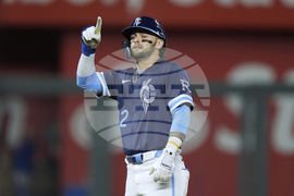 Kansas City Royals' Tyler Tolbert (2) and Jonathan India walk off the field after their baseball game against the Toronto Blue Jays, Friday, Sept. 19, 2025, in Kansas City, Mo. (AP Photo/Charlie Riedel)