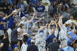 Fans reach for a foul ball hit by Kansas City Royals' Maikel Garcia during the fifth inning of a baseball game against the Toronto Blue Jays, Friday, Sept. 19, 2025, in Kansas City, Mo. (AP Photo/Charlie Riedel)
