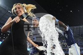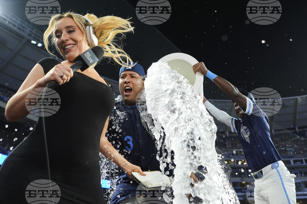 Kansas City Royals' Salvador Perez, center, is doused by teammates while being interviewed by Apple TV sports commentator Tricia Whitaker after a baseball game against the Toronto Blue Jays, Friday, Sept. 19, 2025, in Kansas City, Mo. (AP Photo/Charlie Riedel)
