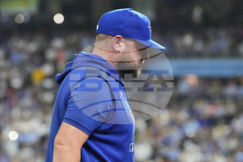 Toronto Blue Jays manager John Schneider walks to the dugout after getting ejected during the sixth inning of a baseball game against the Kansas City Royals, Friday, Sept. 19, 2025, in Kansas City, Mo. (AP Photo/Charlie Riedel)