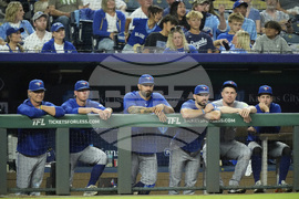 The Toronto Blue Jays bench watches during the ninth inning of a baseball game against the Kansas City Royals, Friday, Sept. 19, 2025, in Kansas City, Mo. (AP Photo/Charlie Riedel)