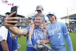 Kansas City Royals' Jac Caglianone, left, poses for a photo with Jaxson Kress, right, during fan appreciation day prior to a baseball game against the Toronto Blue Jays, Saturday Sept. 20, 2025, in Kansas City, Mo. (AP Photo/Ed Zurga)