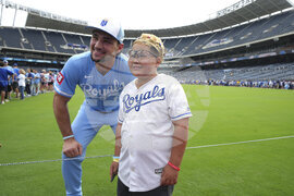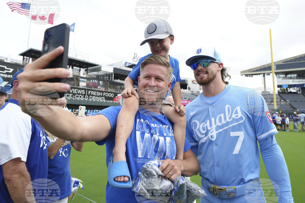 Kansas City Royals shortstop Bobby Witt Jr. (7) poses for a photo with Hunter Lysaught and his son, Malachi, during fan appreciation day prior to a baseball game against the Toronto Blue Jays, Saturday Sept. 20, 2025, in Kansas City, Mo. (AP Photo/Ed Zurga)