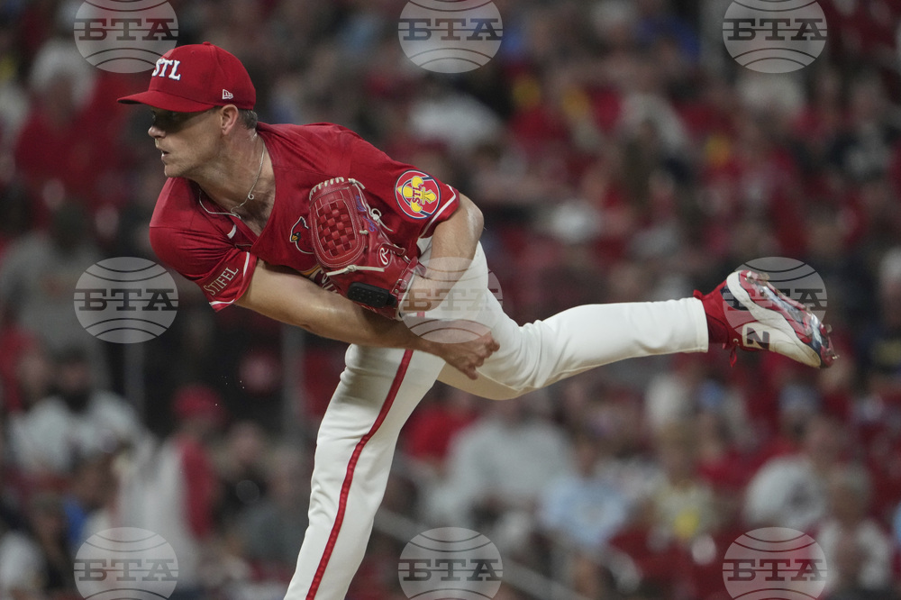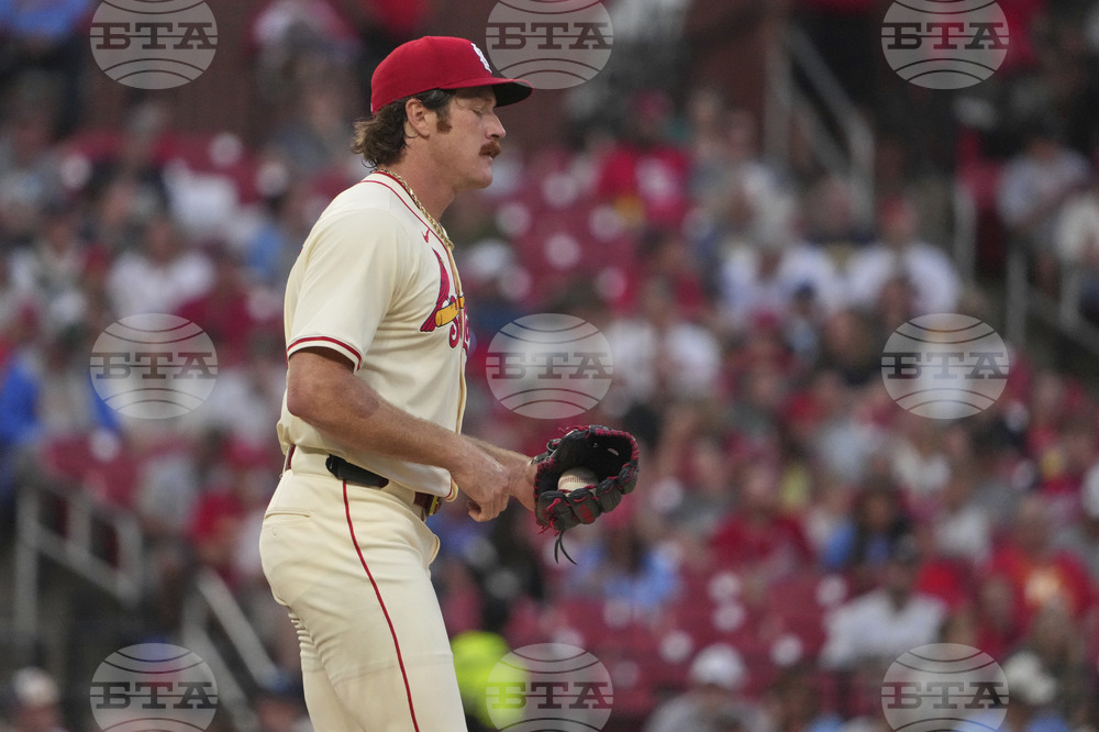 St. Louis Cardinals starting pitcher Miles Mikolas throws during the first inning of a baseball game against the Milwaukee Brewers Saturday, Sept. 20, 2025, in St. Louis. (AP Photo/Jeff Roberson)