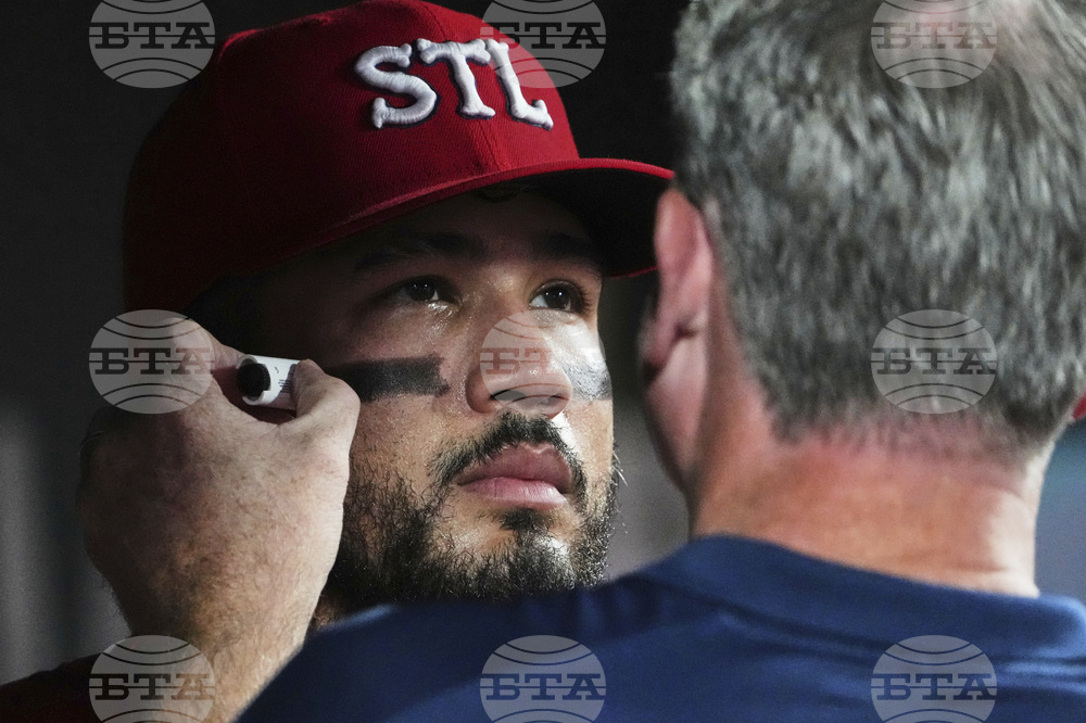 St. Louis Cardinals catcher Ivan Herrera has eye black applied during the first inning of a baseball game against the Milwaukee Brewers Friday, Sept. 19, 2025, in St. Louis. (AP Photo/Jeff Roberson)