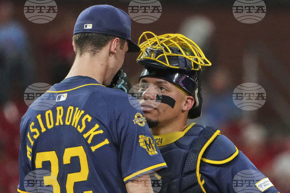 Milwaukee Brewers starting pitcher Jacob Misiorowski is removed by manager Pat Murphy during the fourth inning of a baseball game against the St. Louis Cardinals Friday, Sept. 19, 2025, in St. Louis. (AP Photo/Jeff Roberson)