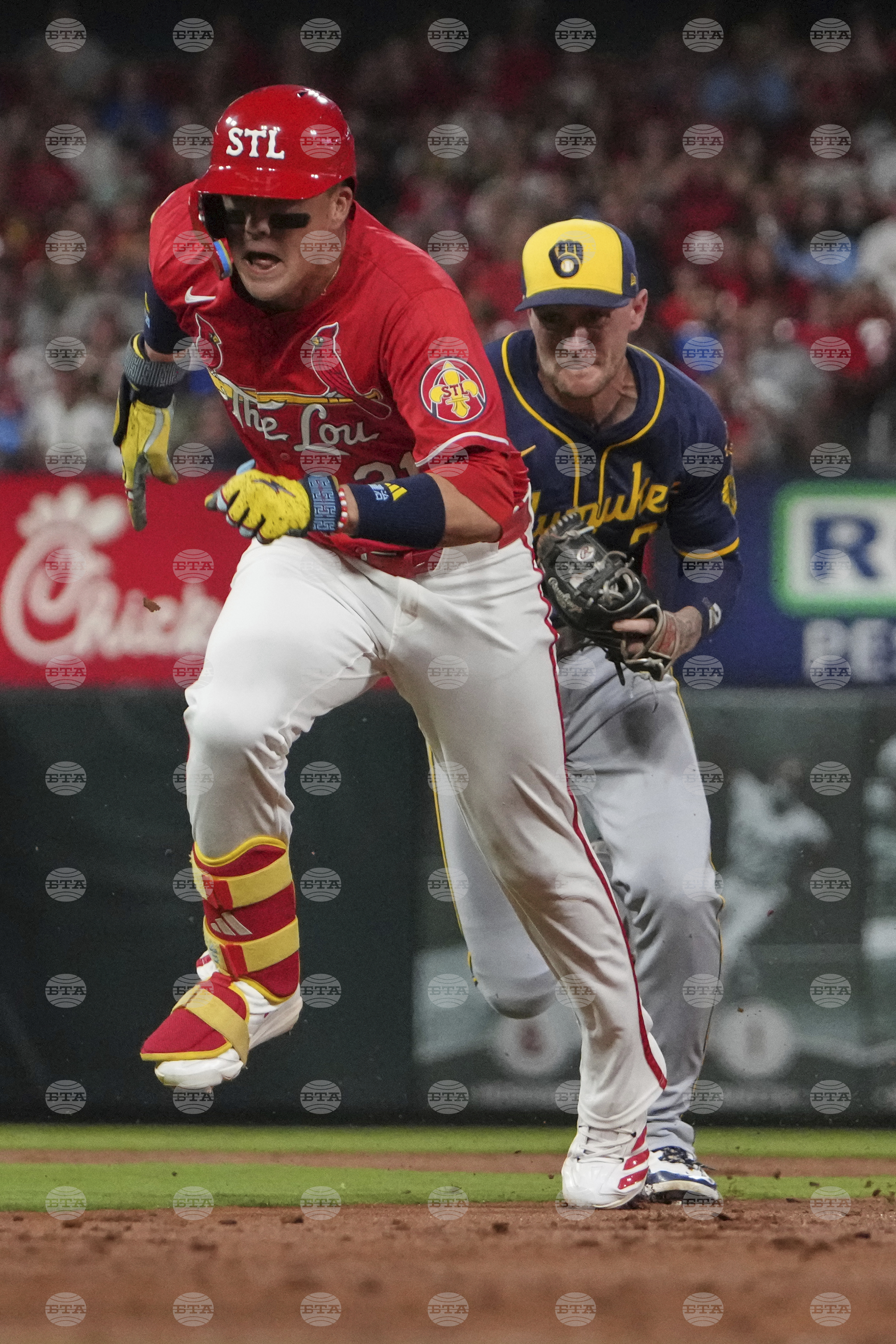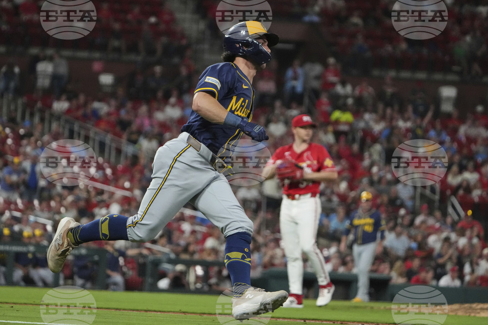 Milwaukee Brewers' Andrew Vaughn rounds first on a ground-rule double during the fourth inning of a baseball game against the St. Louis Cardinals Saturday, Sept. 20, 2025, in St. Louis. (AP Photo/Jeff Roberson)