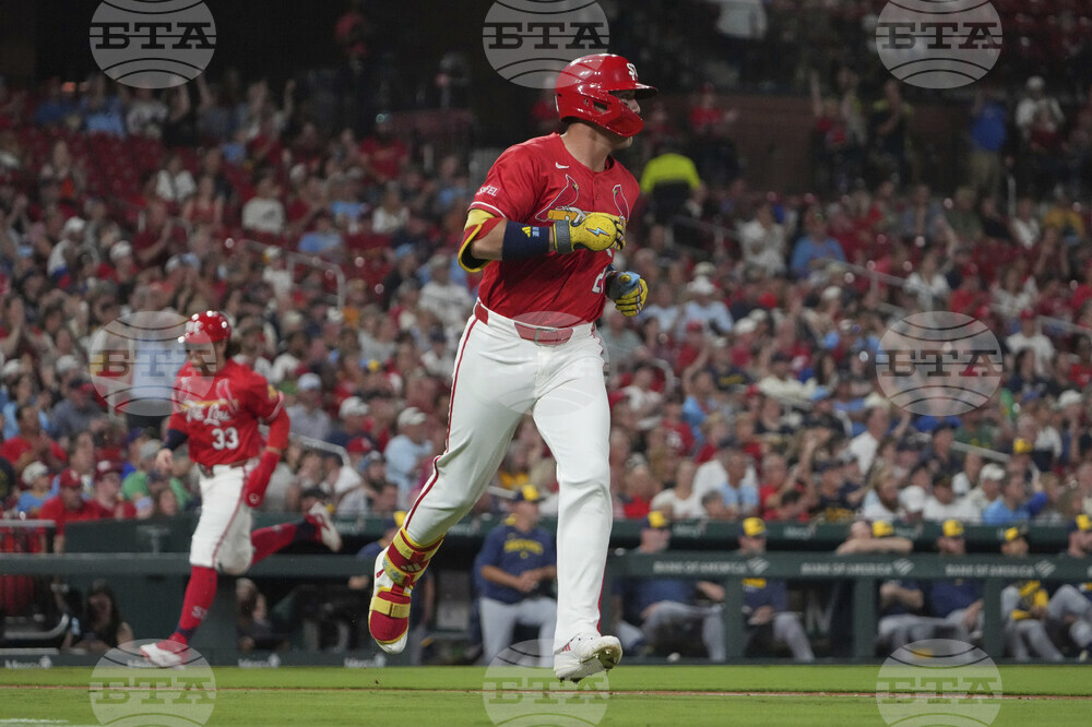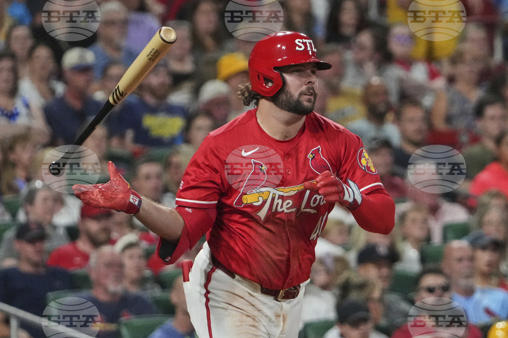 St. Louis Cardinals' Alec Burleson drops his bat after hitting a single during the fifth inning of a baseball game against the Milwaukee Brewers Friday, Sept. 19, 2025, in St. Louis. (AP Photo/Jeff Roberson)