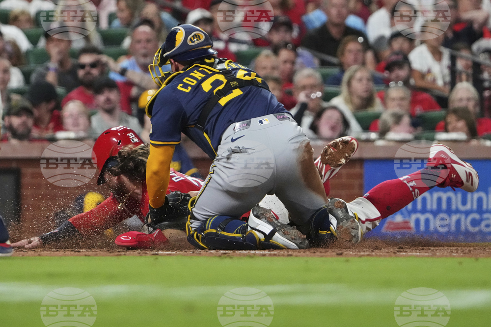 St. Louis Cardinals' Brendan Donovan is tagged out at home by Milwaukee Brewers catcher William Contreras (24) during the third inning of a baseball game Friday, Sept. 19, 2025, in St. Louis. (AP Photo/Jeff Roberson)