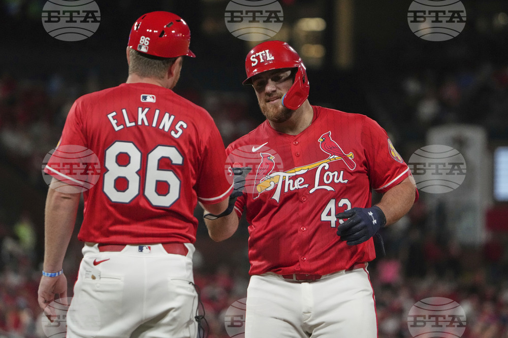 St. Louis Cardinals' Pedro Pages (43) is congratulated by first base coach Packy Elkins (86) after hitting a single during the fourth inning of a baseball game against the St. Louis Cardinals Friday, Sept. 19, 2025, in St. Louis. (AP Photo/Jeff Roberson)