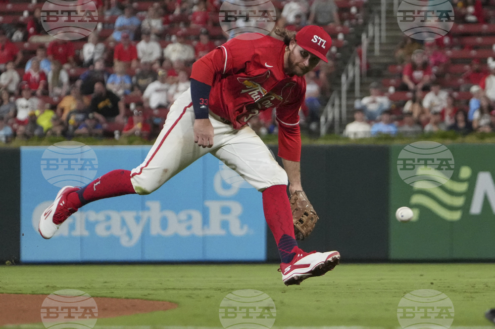 St. Louis Cardinals second baseman Brendan Donovan is unable to reach a single by Milwaukee Brewers' Christian Yelich during the fifth inning of a baseball game Friday, Sept. 19, 2025, in St. Louis. (AP Photo/Jeff Roberson)
