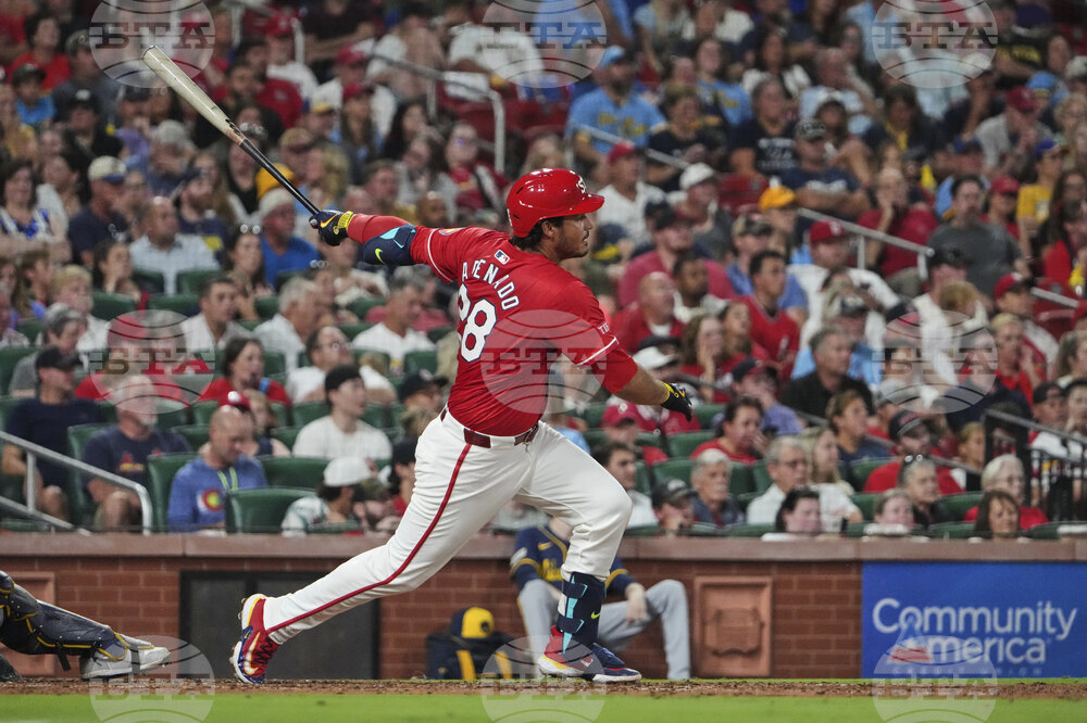 St. Louis Cardinals' Pedro Pages singles during the fourth inning of a baseball game against the Milwaukee Brewers Friday, Sept. 19, 2025, in St. Louis. (AP Photo/Jeff Roberson)