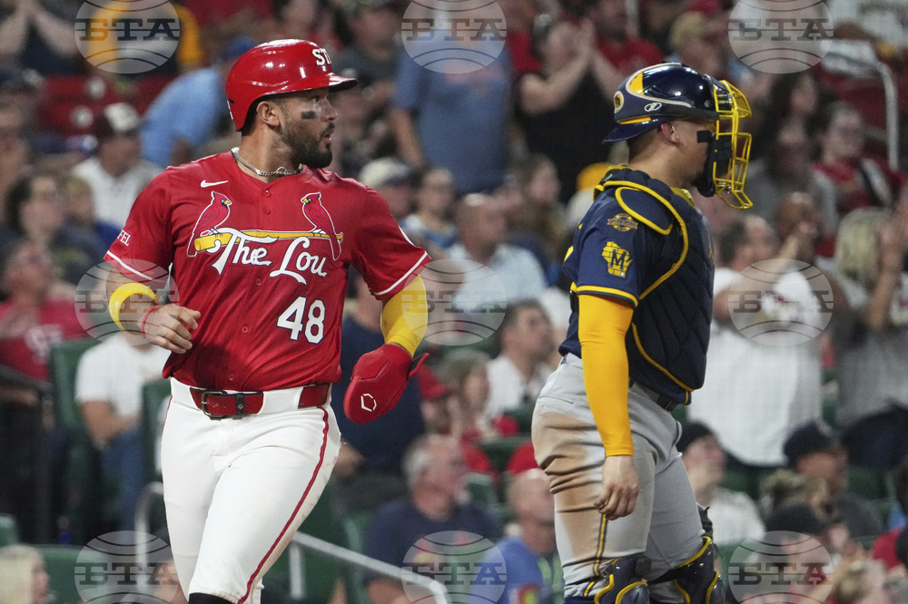 Milwaukee Brewers' Jake Bauers (9) scores past St. Louis Cardinals catcher Pedro Pages during the second inning of a baseball game Saturday, Sept. 20, 2025, in St. Louis. (AP Photo/Jeff Roberson)