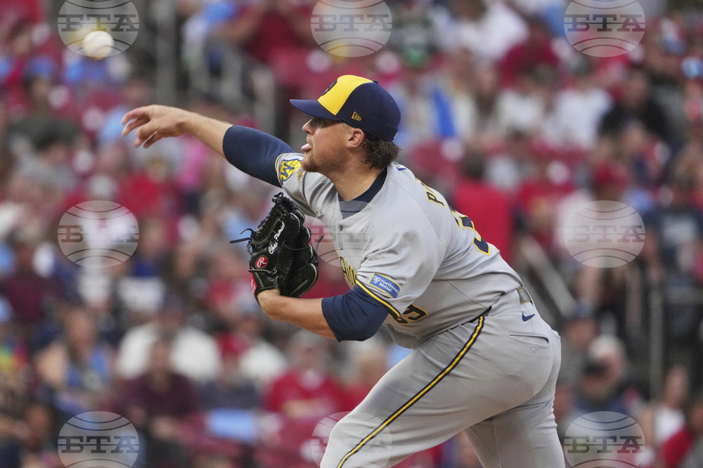 Milwaukee Brewers starting pitcher Chad Patrick throws during the first inning of a baseball game against the St. Louis Cardinals Saturday, Sept. 20, 2025, in St. Louis. (AP Photo/Jeff Roberson)