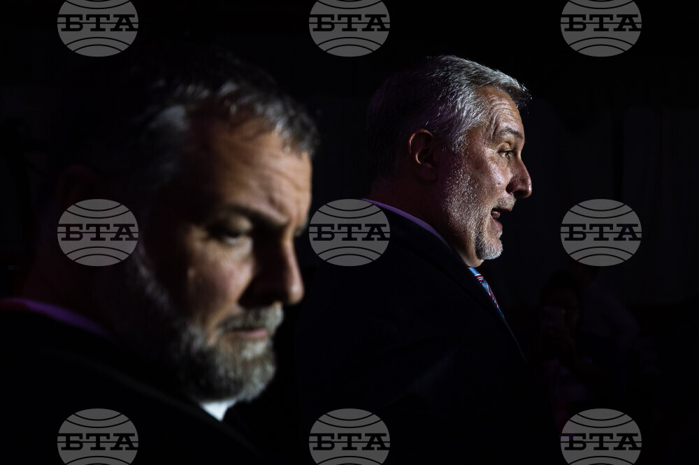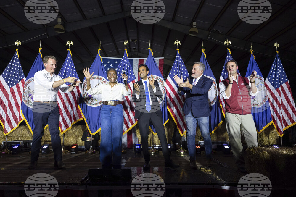 Ohio Republican gubernatorial candidate Vivek Ramaswamy, left, and Virginia Governor Glenn Youngkin attend a campaign rally for Virginia Republican gubernatorial candidate Winsome Earle-Sears in Chesterfield, Va., Friday, Sept. 19, 2025. (Mike Kropf/Richmond Times-Dispatch via AP)