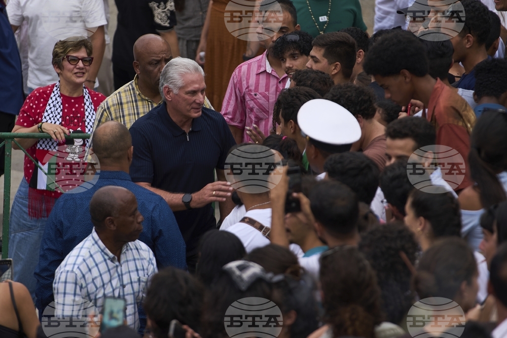 Cuba's President Miguel Diaz-Canel, center left, greets people as he arrives to attend Silvio Rodríguez's launch of his five-country tour, in Havana, Friday, Sept. 19, 2025. (AP Photo/Ramon Espinosa)