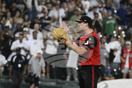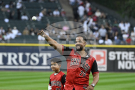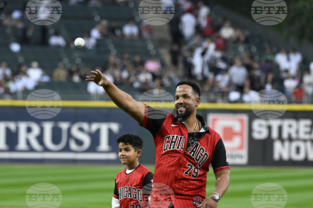 Former Chicago White Sox player Jose Abreu, right, throws out a ceremonial first pitch before a baseball game against the San Diego Padres, Friday, Sept. 19, 2025, in Chicago. (AP Photo/Matt Marton)