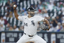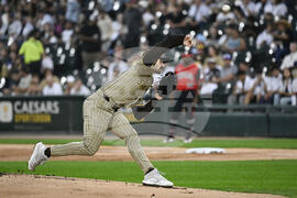 Chicago White Sox starting pitcher Yoendrys Gomez (94) delivers a pitch against the San Diego Padres during the first inning of a baseball game, Saturday, Sept. 20, 2025, in Chicago. (AP Photo/Kamil Krzaczynski)