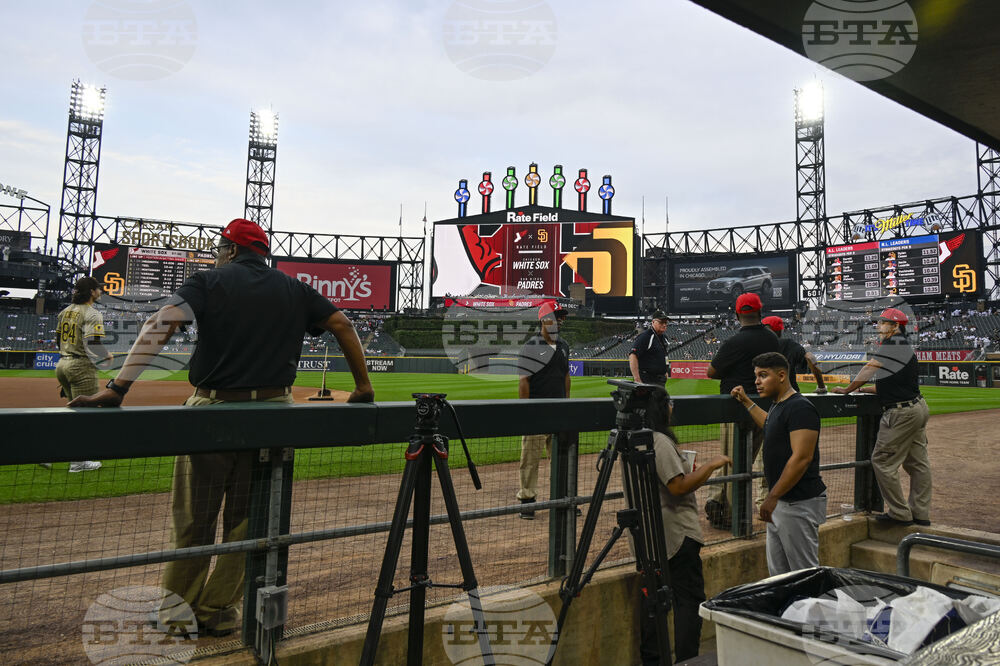 Chicago White Sox grounds crew members look on before a baseball game against the San Diego Padres, Friday, Sept. 19, 2025, in Chicago. (AP Photo/Matt Marton)