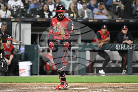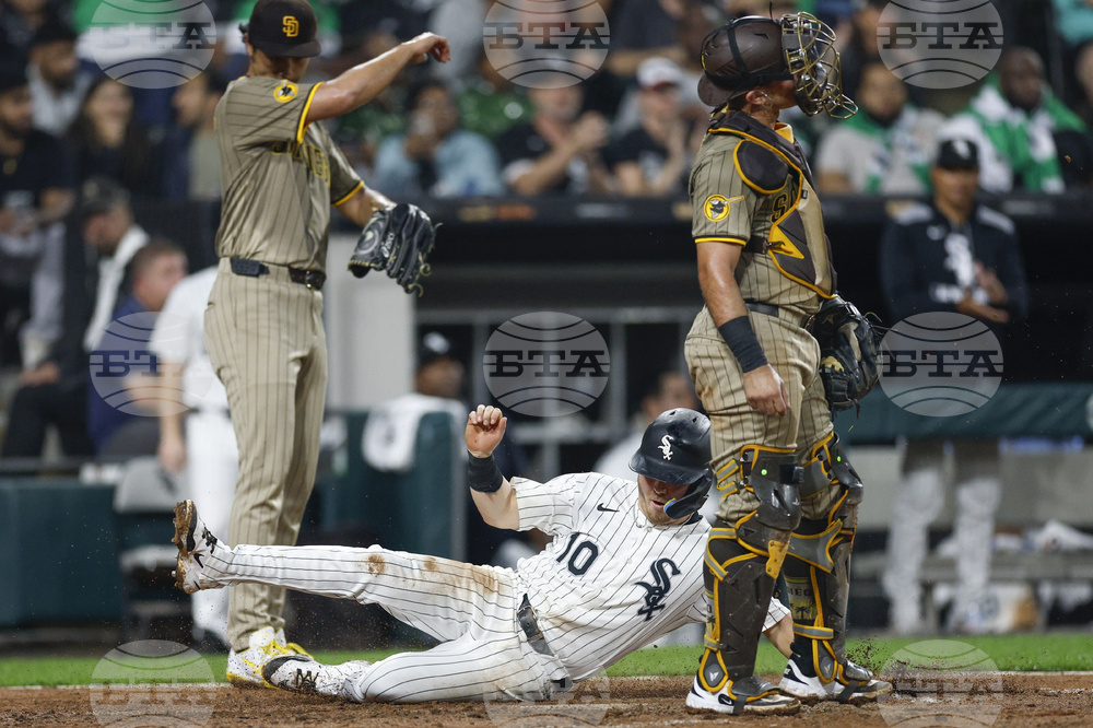 San Diego Padres' Ramón Laureano, right, scores against the Chicago White Sox during the fourth inning of a baseball game against the Chicago White Sox, Friday, Sept. 19, 2025, in Chicago. (AP Photo/Matt Marton)