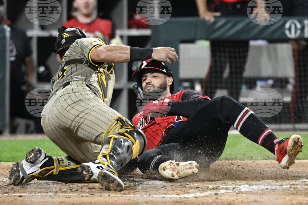 Chicago White Sox's Edgar Quero, right, scores against San Diego Padres catcher Freddy Fermin, left, during the fourth inning of a baseball game, Friday, Sept. 19, 2025, in Chicago. (AP Photo/Matt Marton)