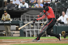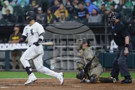 Chicago White Sox's Curtis Mead hits an RBI single during the fourth inning of a baseball game against the San Diego Padres, Friday, Sept. 19, 2025, in Chicago. (AP Photo/Matt Marton)