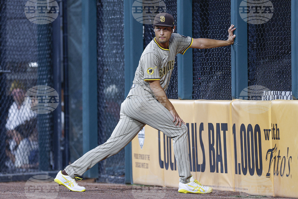 San Diego Padres starting pitcher Yu Darvish warms up before a baseball game against the Chicago White Sox, Saturday, Sept. 20, 2025, in Chicago. (AP Photo/Kamil Krzaczynski)