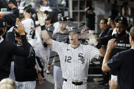 Chicago White Sox shortstop Colson Montgomery (12) scores on a double hit by third baseman Miguel Vargas against the San Diego Padres during the first inning of a baseball game, Saturday, Sept. 20, 2025, in Chicago. (AP Photo/Kamil Krzaczynski)