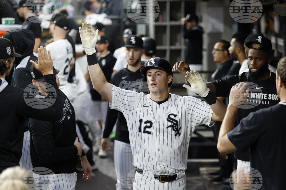 Chicago White Sox shortstop Colson Montgomery (12) celebrates with teammates in the dugout after scoring on a double hit by third baseman Miguel Vargas against the San Diego Padres during the first inning of a baseball game, Saturday, Sept. 20, 2025, in Chicago. (AP Photo/Kamil Krzaczynski)
