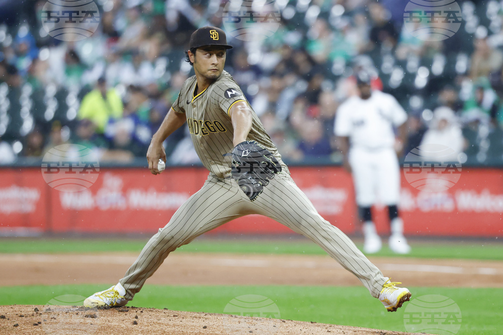 San Diego Padres starting pitcher Yu Darvish (11) delivers a pitch against the Chicago White Sox during the first inning of a baseball game, Saturday, Sept. 20, 2025, in Chicago. (AP Photo/Kamil Krzaczynski)