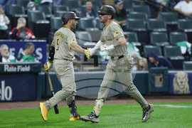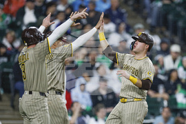 San Diego Padres designated hitter Gavin Sheets, left, celebrates with Jackson Merrill, right, and Manny Machado, center, after a double hit by Ryan O'Hearn against the Chicago White Sox during the sixth inning of a baseball game, Saturday, Sept. 20, 2025, in Chicago. (AP Photo/Kamil Krzaczynski)