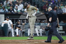 San Diego Padres' Jackson Merrill slams his bat after striking out swinging during the eighth inning of a baseball game against the Chicago White Sox, Friday, Sept. 19, 2025, in Chicago. (AP Photo/Matt Marton)